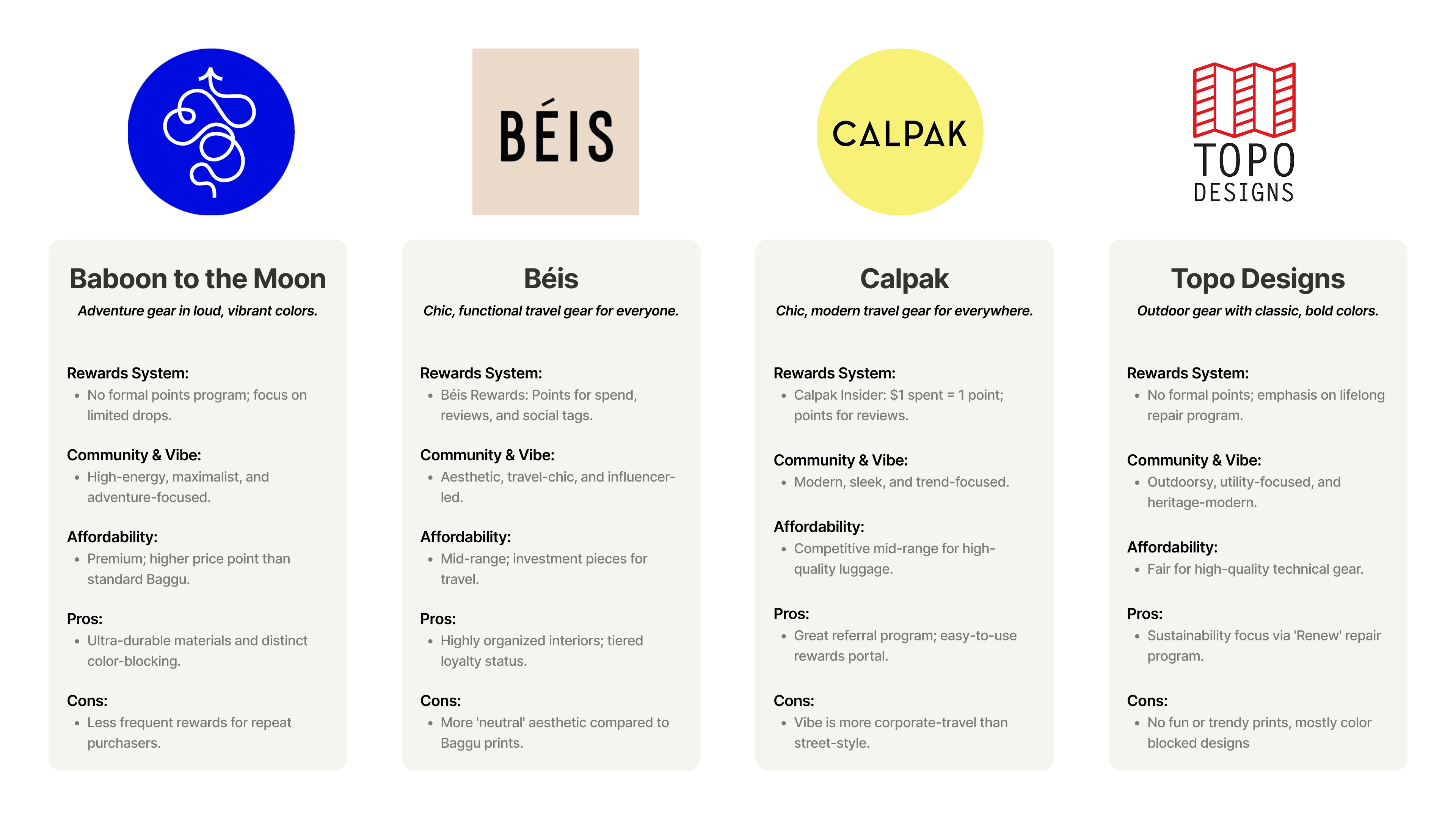 Among brands that value sustainability, utility, and fun design, Baboon to the Moon, Béis, Calpak, and Topo Designs offer adventure, organization, trends, and durability. Despite varying loyalty systems, all four prioritize unique styling and community engagement
