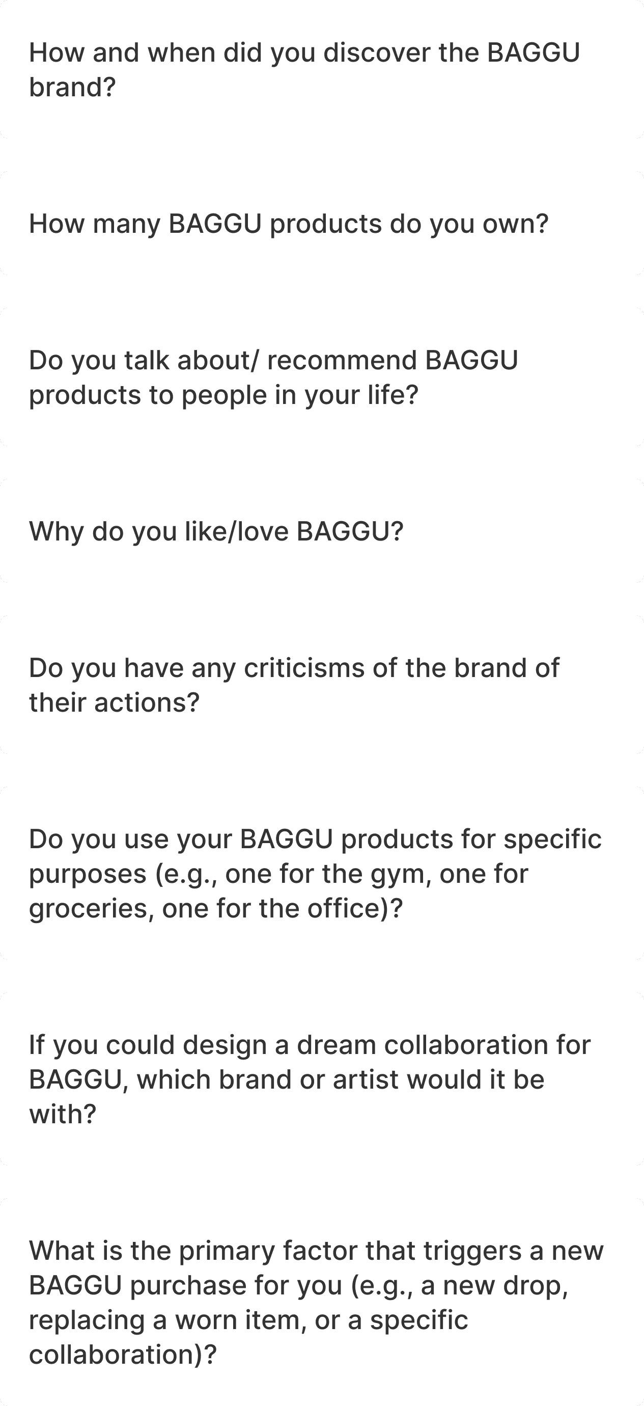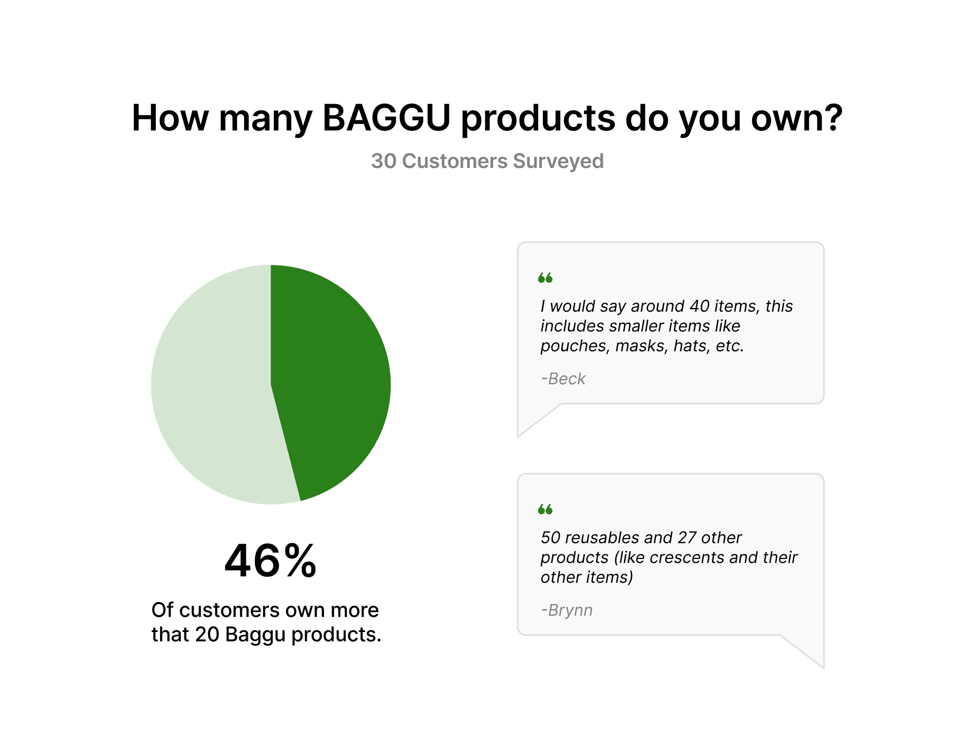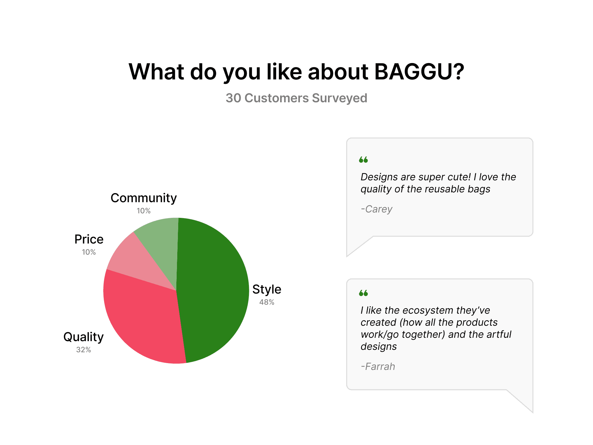 I interviewed 30 Baggu customers through an online survey. The questions related to the products they own, and their thoughts on the Baggu community and brand,