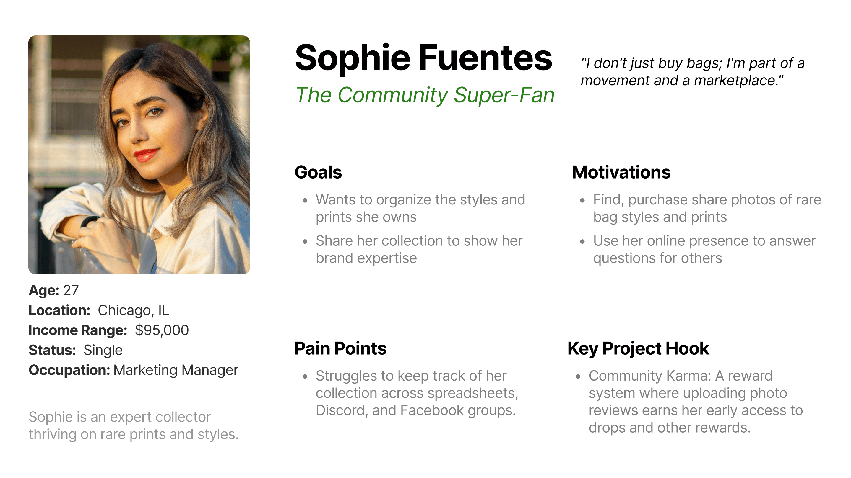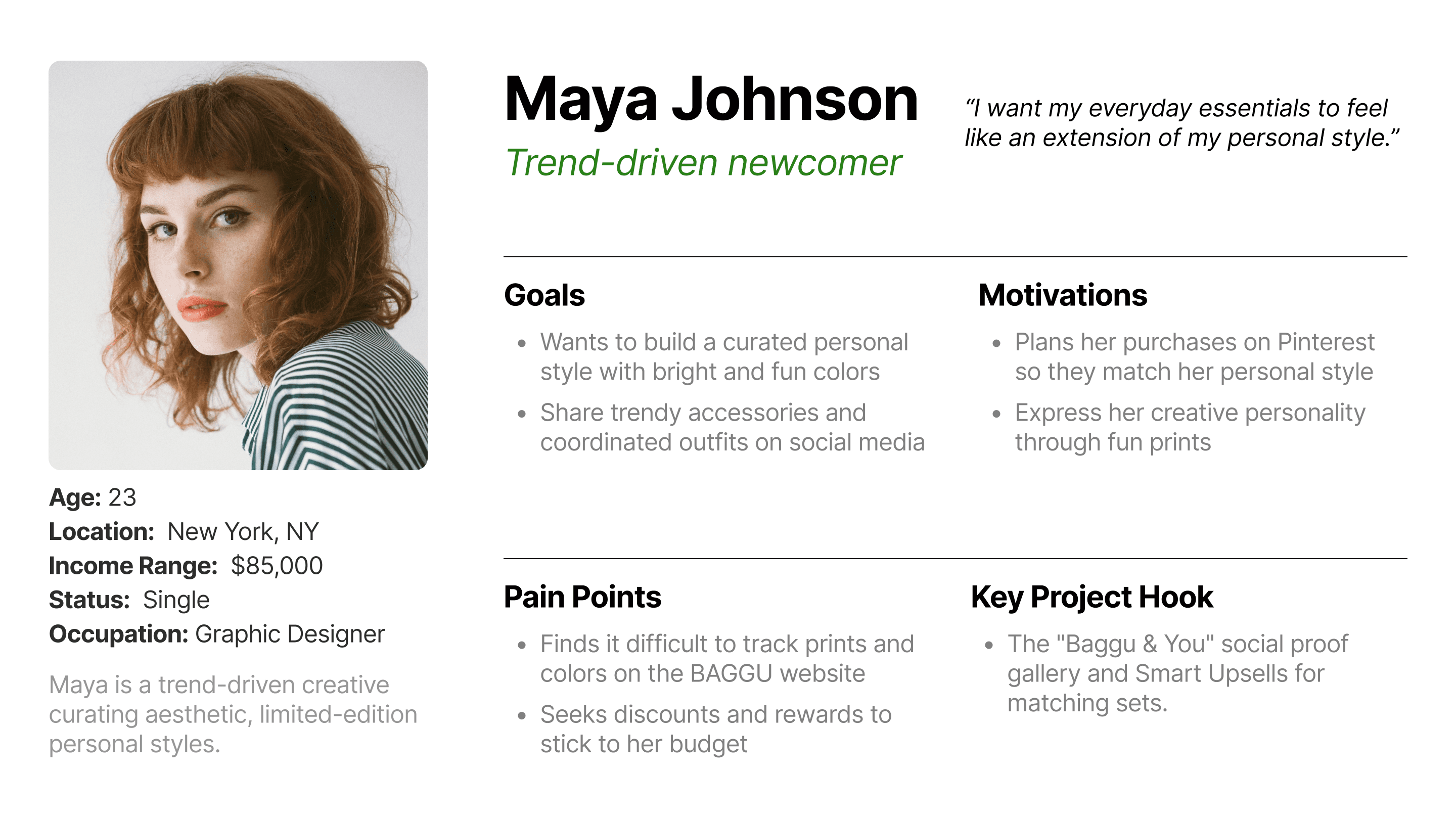 Based on interview analysis, I identified two major user groups for BAGGU: Trend-driven customers and community driven customers. Trend driven customers follow fashion trends on social media and aim to update thei rpersonal style to express themselves and appear on-trend. Community driven customers like what BAGGU stands for (sustainability, fun and utility) and enjoys meeting others who do as well. Community driven customers often find social media groups or online foums to chat with others about their purchases.