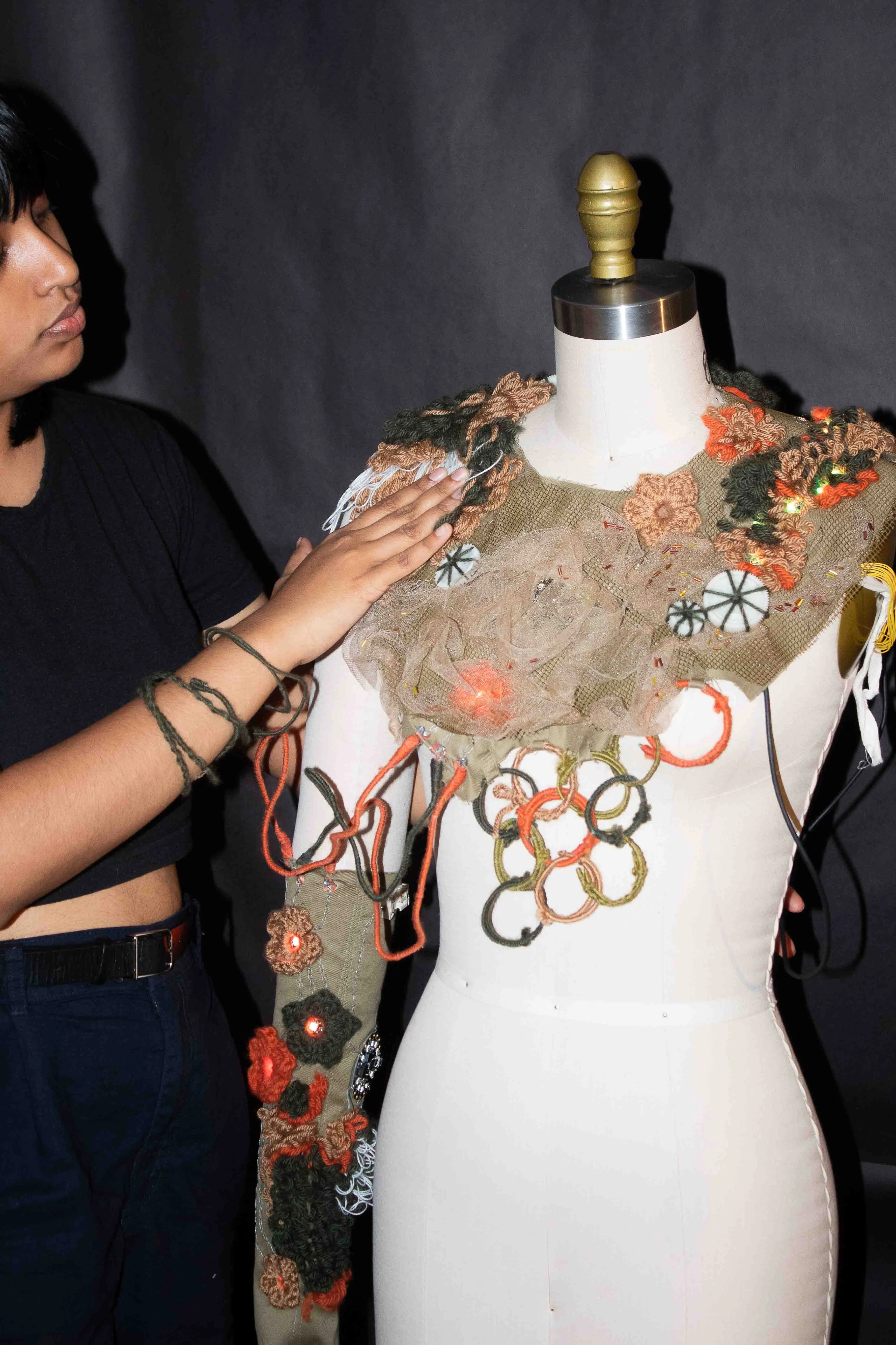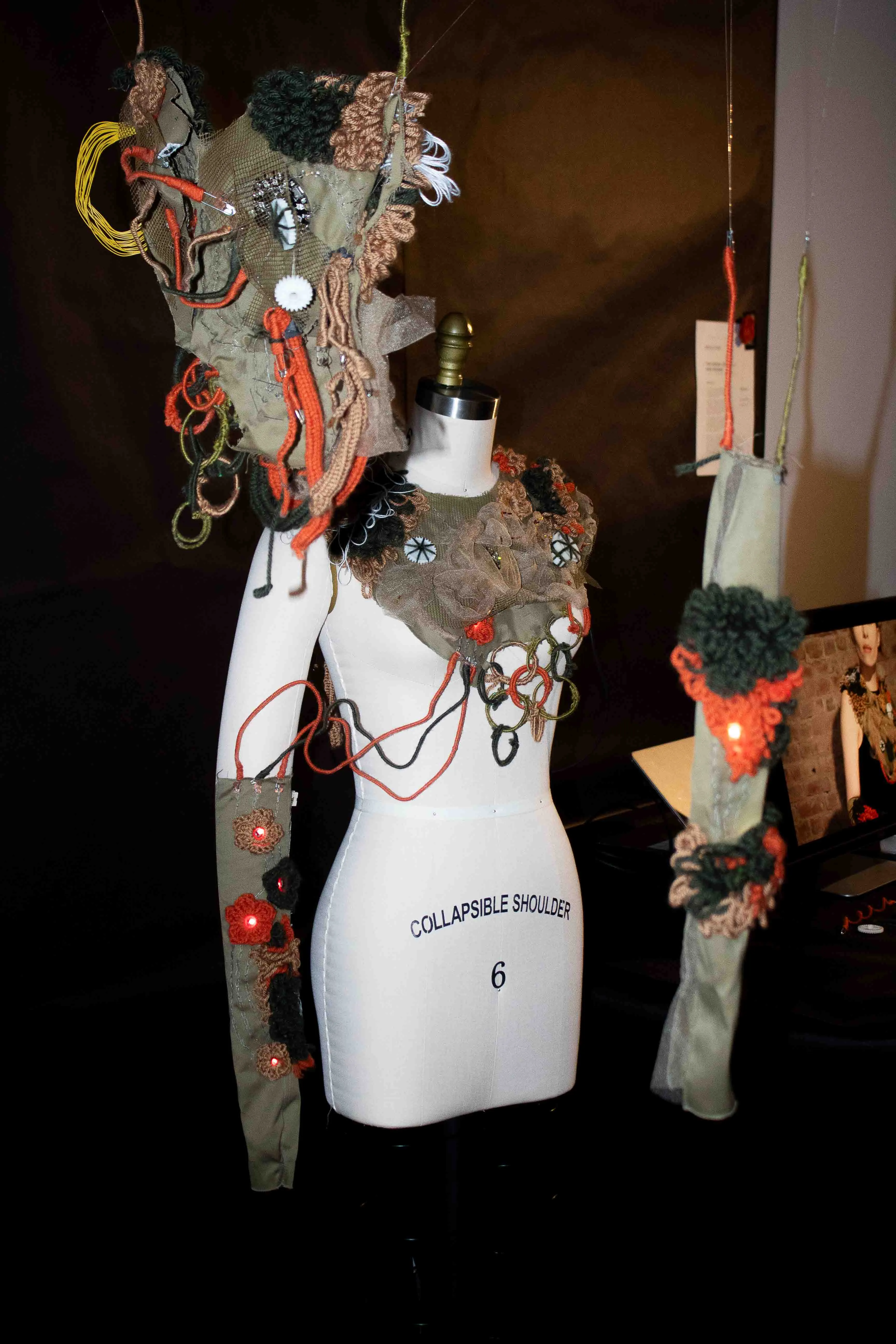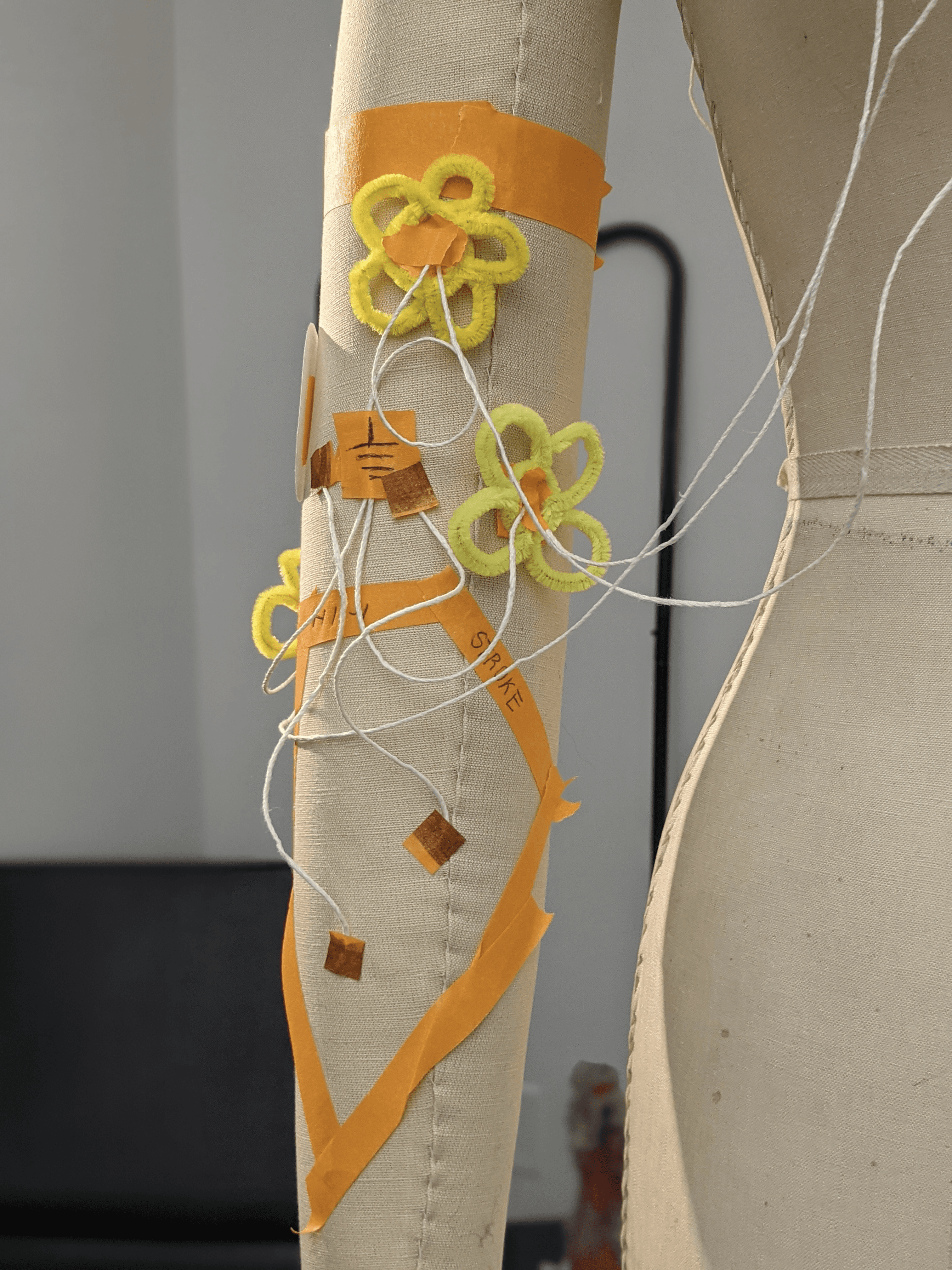 On a dress form, we mapped out every component and layer needed with paper, pipe cleaners and cotton string.